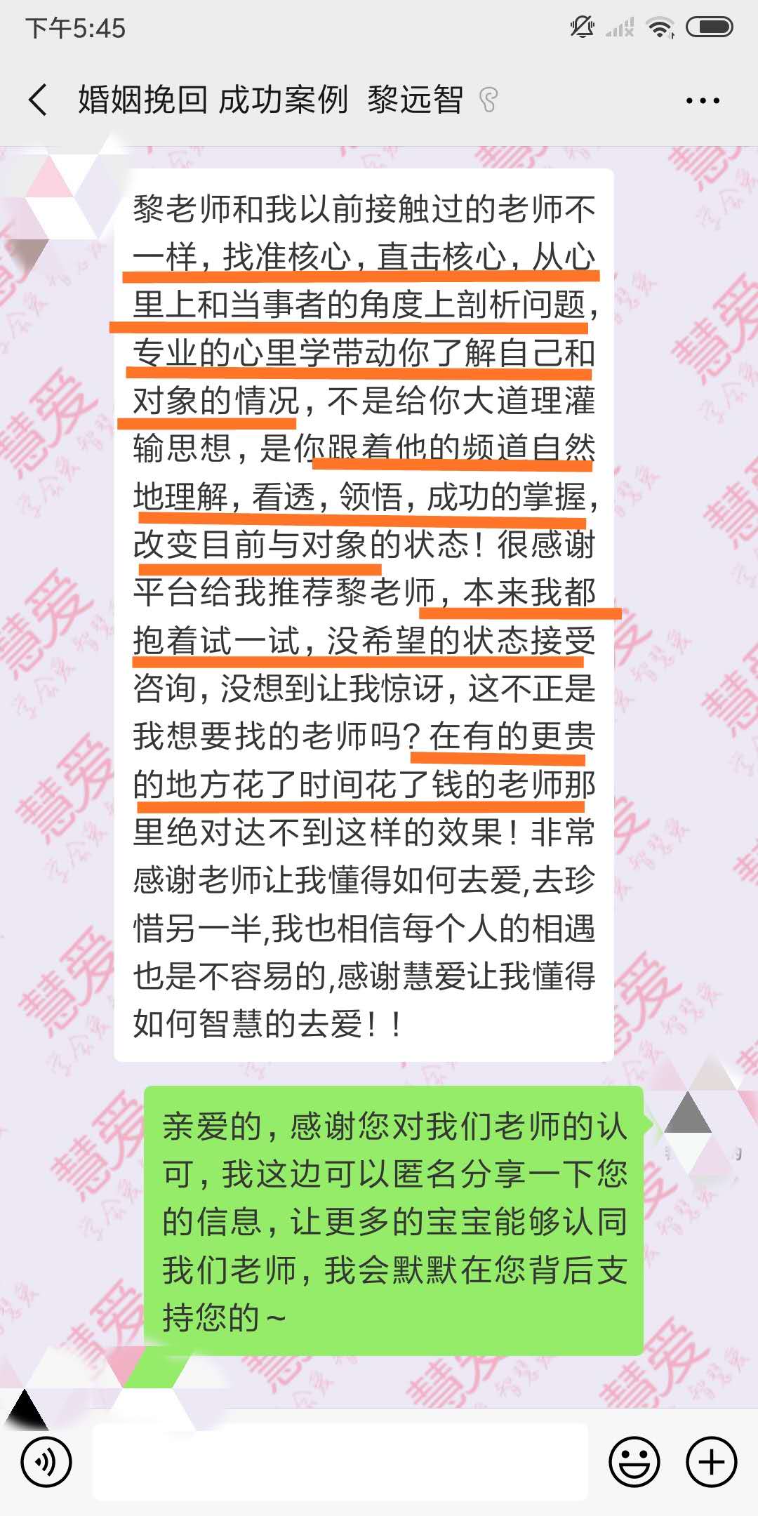 如果你为了挽回,用尽一切方法依然失败,只要你配合晚晴团队指导,他将主动跑回你身边,这种成功案例,我们已经屡见不鲜!